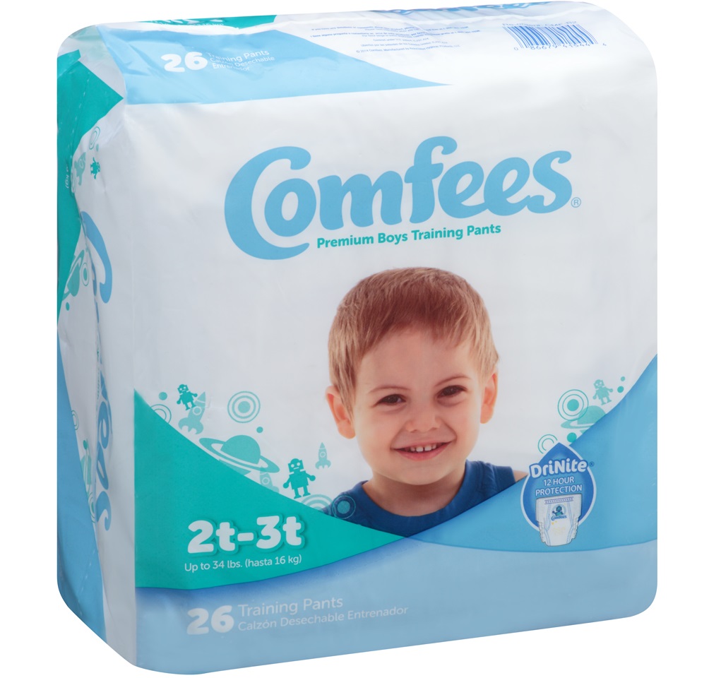 Comfees® Premium Training Pants are offered in fun boy and girl designs that kids will love and will help aid in the training process. Training Pants have soft, stretchable side panels that pull on like real underwear, easy, tear-away sides for quick removal, and are perfume and latex free.