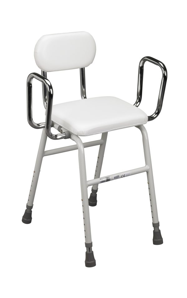 This all-purpose, Kitchen Stool, by Drive Medical is convenient and comfortable for everyday use. The stool features a padded seat and back for added comfort and an angled seat that makes sitting down and getting up easy. This stool also comes standard with removable arm supports with adjustable width to accommodate users size.