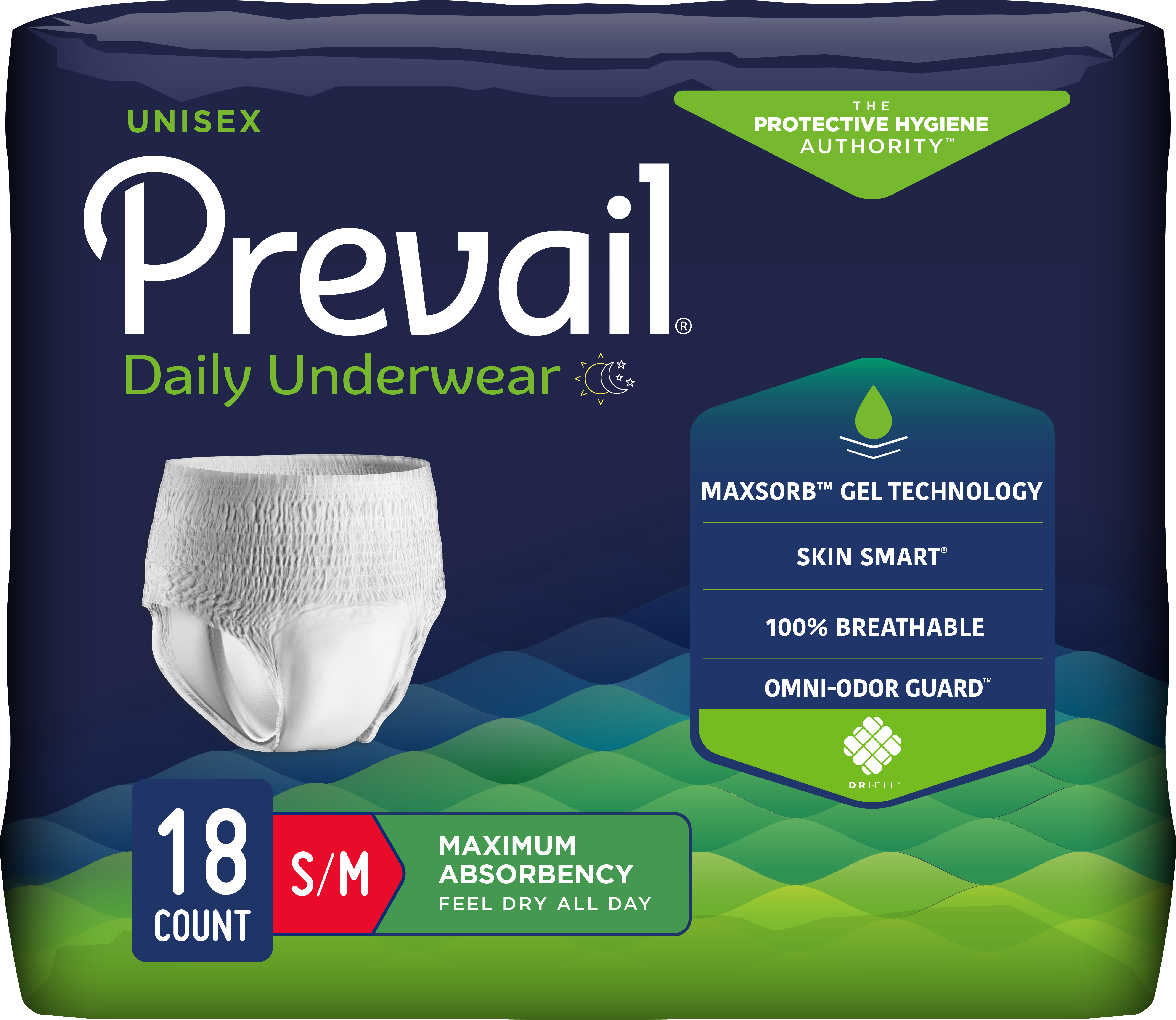Every Prevail® protective undergarment is designed with four things in mind: comfort, absorbency, skin health, and discretion. Prevail® Maximum Absorbency Unisex Underwear is designed for both men and women who need moderate to heavy leakage protection. Prevail® features MaxSorb™ Gel technology which actively locks up moisture to help keep you feeling cleaner, fresher, and drier. Additional features include: Omni-Odor Guard™ helps neutralizes odors before they begin , AirMax™ breathable cover helps you stay cool and comfortable by allowing air to circulate, Dri-Fit™ to help keep skin dry and healthy by reducing friction, Skin Smart® soft topsheet helps provide comfort to the wearer, Comfort-Shape® Plus with gentle elastics that shape to your body for a more natural fit, Back label with size.